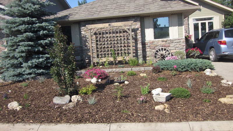 This first one is what the front yard looked like when we purchased the house. The grass was always scruffy... we just couldn't get it to grow. I was also looking for some extra gardening space because our dogs have the run of the backyard, and you know what dogs are like... they chew plants and dig holes. So out went the grass... we brought in some loads of topsoil, and got busy planting.